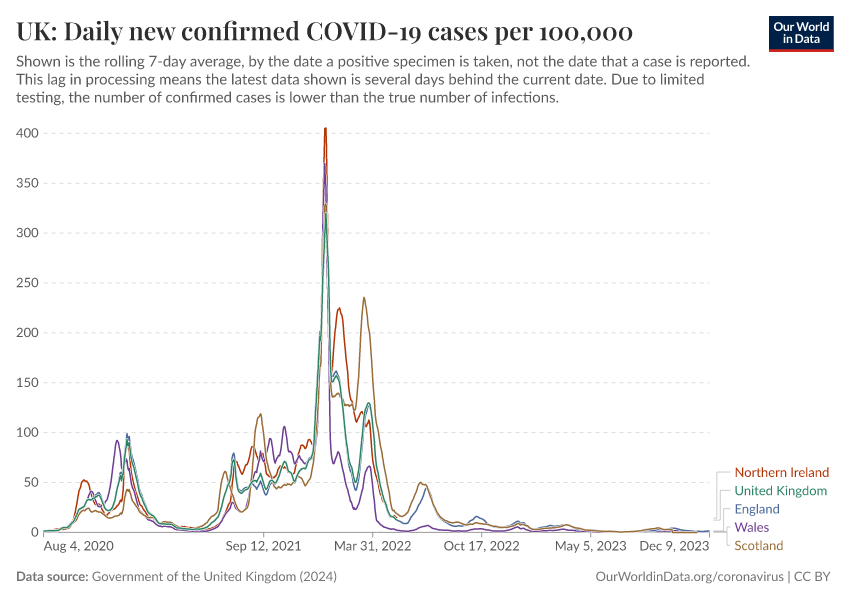 Government of the United Kingdom (2024) – with minor processing by Our World in Data. “UK: Daily new confirmed COVID-19 cases per 100,000” [dataset]. Government of the United Kingdom, “UKHSA data dashboard” [original data]. Retrieved March 9, 2026 from https://who-regions.owid.pages.dev:8789/20260304-094028/grapher/uk-daily-covid-cases-7day-average.html (archived on March 4, 2026).