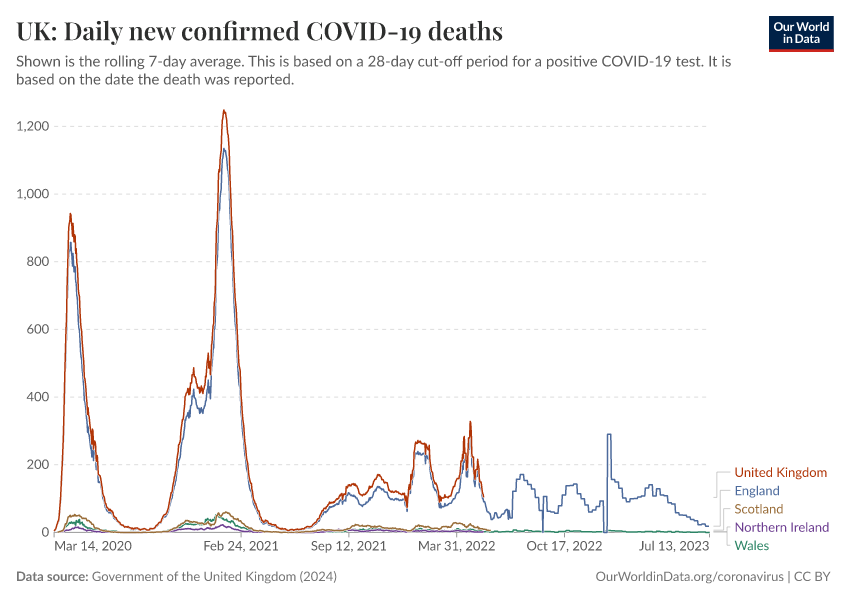 Government of the United Kingdom (2024) – with minor processing by Our World in Data. “UK: Daily new confirmed COVID-19 deaths” [dataset]. Government of the United Kingdom, “UKHSA data dashboard” [original data]. Retrieved March 9, 2026 from https://who-regions.owid.pages.dev:8789/20260304-094028/grapher/uk-daily-covid-deaths.html (archived on March 4, 2026).