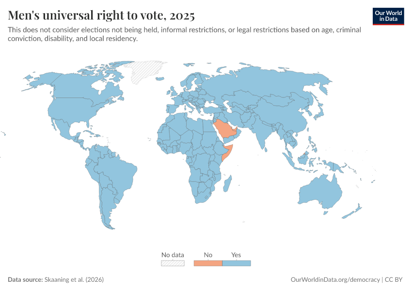 “Data Page: Men's universal right to vote”, part of the following publication: Bastian Herre, Lucas Rodés-Guirao, and Esteban Ortiz-Ospina (2013) - “Democracy”. Data adapted from Skaaning et al.. Retrieved from https://who-regions.owid.pages.dev:8789/20260304-094028/grapher/universal-suffrage-men-lexical.html [online resource] (archived on March 4, 2026).How to cite this data