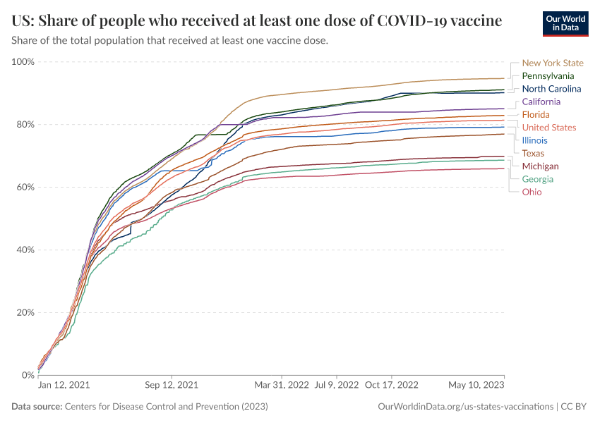 Centers for Disease Control and Prevention (2023) – processed by Our World in Data. “US: Share of people who received at least one dose of COVID-19 vaccine” [dataset]. Centers for Disease Control and Prevention, “COVID-19, Vaccinations (United States)” [original data]. Retrieved March 9, 2026 from https://who-regions.owid.pages.dev:8789/20260304-094028/grapher/us-covid-19-share-people-vaccinated.html (archived on March 4, 2026).