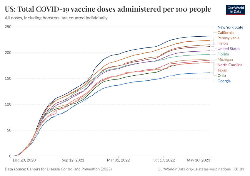 “Data Page: US: Total COVID-19 vaccine doses administered per 100 people”, part of the following publication: Edouard Mathieu, Hannah Ritchie, Lucas Rodés-Guirao, Cameron Appel, Daniel Gavrilov, Charlie Giattino, Joe Hasell, Bobbie Macdonald, Saloni Dattani, Diana Beltekian, Esteban Ortiz-Ospina, and Max Roser (2020) - “COVID-19 Pandemic”. Data adapted from Centers for Disease Control and Prevention. Retrieved from https://who-regions.owid.pages.dev:8789/20260304-094028/grapher/us-state-covid-vaccines-per-100.html [online resource] (archived on March 4, 2026).How to cite this data