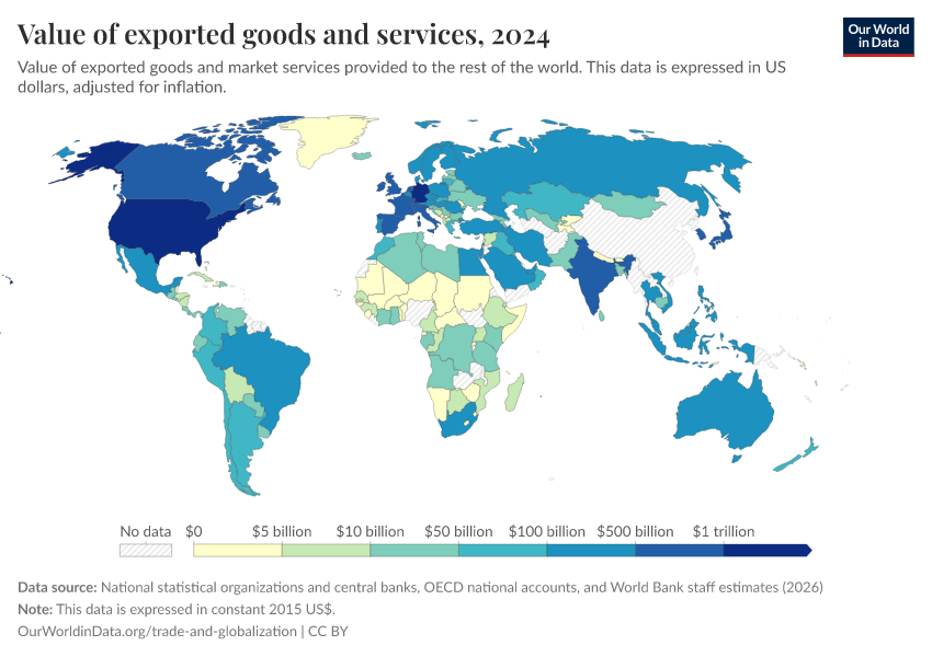 “Data Page: Value of exported goods and services”. Our World in Data (2026). Data adapted from National statistical organizations and central banks, OECD national accounts, and World Bank staff estimates. Retrieved from https://who-regions.owid.pages.dev:8789/20260304-094028/grapher/value-of-exported-goods-and-services.html [online resource] (archived on March 4, 2026).How to cite this data
