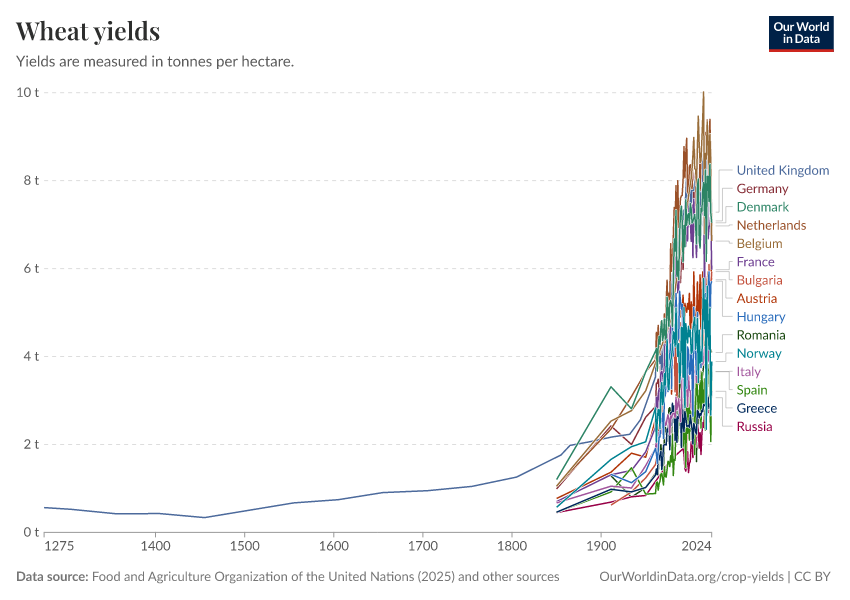 Food and Agriculture Organization of the United Nations (2025); Broadberry et al. (2015); Brassley (2000); Bayliss-Smith & Wanmali (1984) – with major processing by Our World in Data. “Wheat yields” [dataset]. Food and Agriculture Organization of the United Nations, “Production: Crops and livestock products”; Broadberry et al., “Long-term crop yields in UK”; Brassley, “Long-term crop yields in UK”; Bayliss-Smith & Wanmali, “Understanding Green Revolutions” [original data]. Retrieved March 9, 2026 from https://who-regions.owid.pages.dev:8789/20260304-110441/grapher/wheat-yields.html (archived on March 4, 2026).