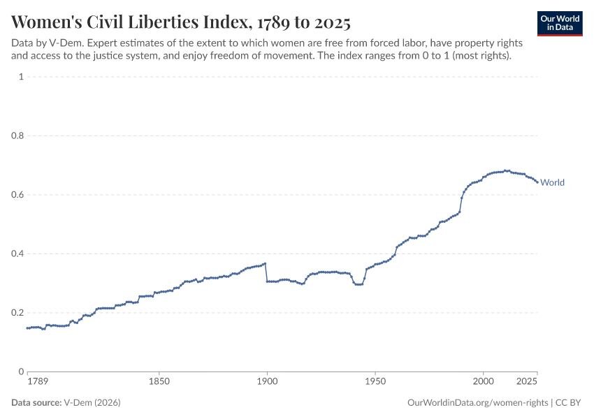 V-Dem (2025) – processed by Our World in Data. “Women's civil rights index – V-Dem” [dataset]. V-Dem, “Democracy report v15” [original data]. Retrieved March 9, 2026 from https://who-regions.owid.pages.dev:8789/20260304-094028/grapher/women-civil-liberties-index.html (archived on March 4, 2026).