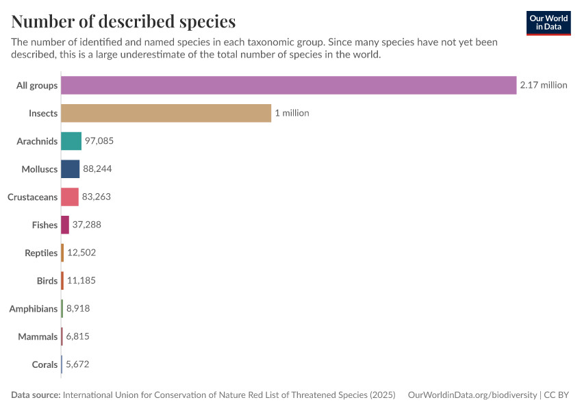 Hannah Ritchie (2022) - “How many species are there?” Published online at OurWorldinData.org. Retrieved from: 'https://who-regions.owid.pages.dev:8789/20260304-094028/how-many-species-are-there.html' [Online Resource] (archived on March 4, 2026).BibTeX citation