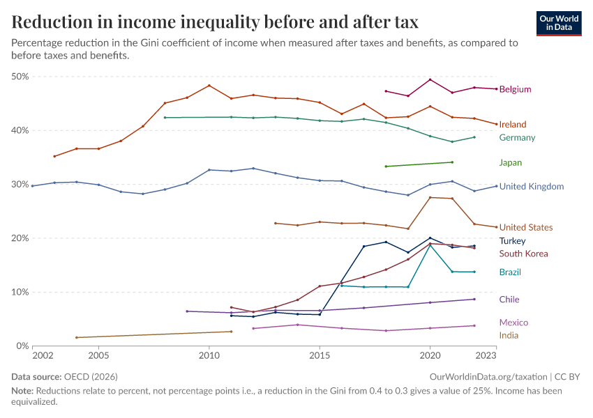 Joe Hasell (2023) - “Income inequality before and after taxes: how much do countries redistribute income?” Published online at OurWorldinData.org. Retrieved from: 'https://who-regions.owid.pages.dev:8789/20260304-094028/income-inequality-before-and-after-taxes.html' [Online Resource] (archived on March 4, 2026).BibTeX citation