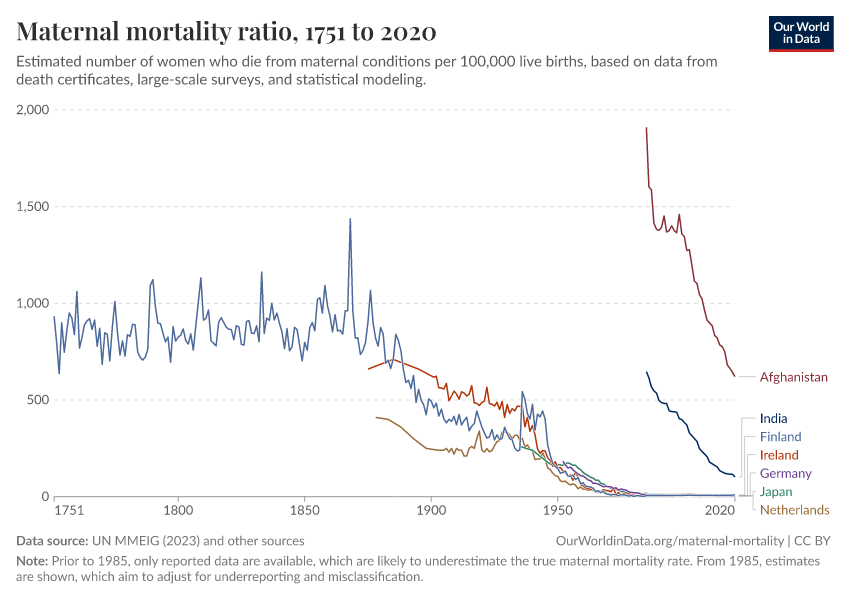 The decline of maternal mortality in Finland, for example, began in the middle of the 19th century and didn’t reach today’s low level more than a century later. In contrast, India and Afghanistan, for example, have achieved large declines much later, but in a shorter amount of time.