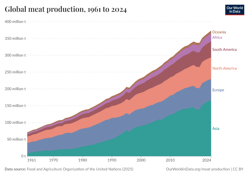 Global meat production has increased rapidly over the past 50 years – as we see, total production has more than quadrupled since 1961. The chart shows global meat production by region, measured in tonnes.