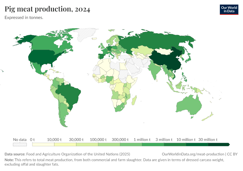 Since the early 1960s, global pigmeat production has also expanded significantly. China is the leading producer, contributing a substantial portion of the world's total pigmeat output. The growth in Chinese pigmeat production has been particularly rapid over the past couple of decades.