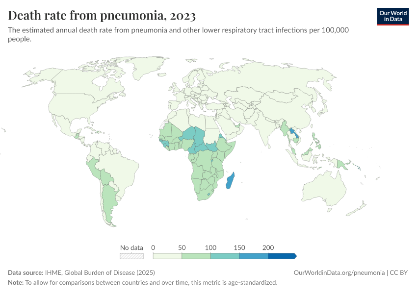 On this topic page, we look at who is suffering from pneumonia and why — and what can we do to reduce the number of people dying from this disease, with interventions such as vaccination, oxygen therapy, reducing air pollution, and more.