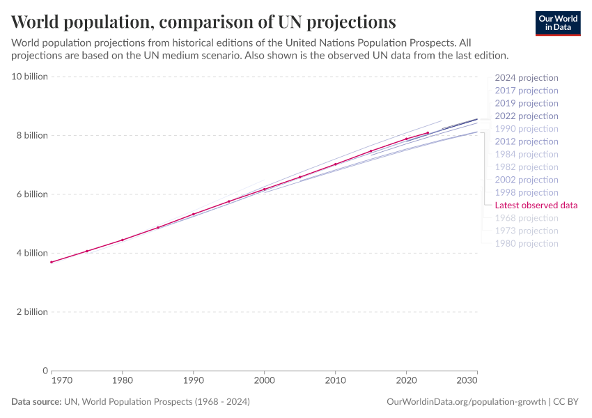 Hannah Ritchie (2023) - “The UN has made population projections for more than 50 years – how accurate have they been?” Published online at OurWorldinData.org. Retrieved from: 'https://who-regions.owid.pages.dev:8789/20260304-094028/population-projections.html' [Online Resource] (archived on March 4, 2026).BibTeX citation