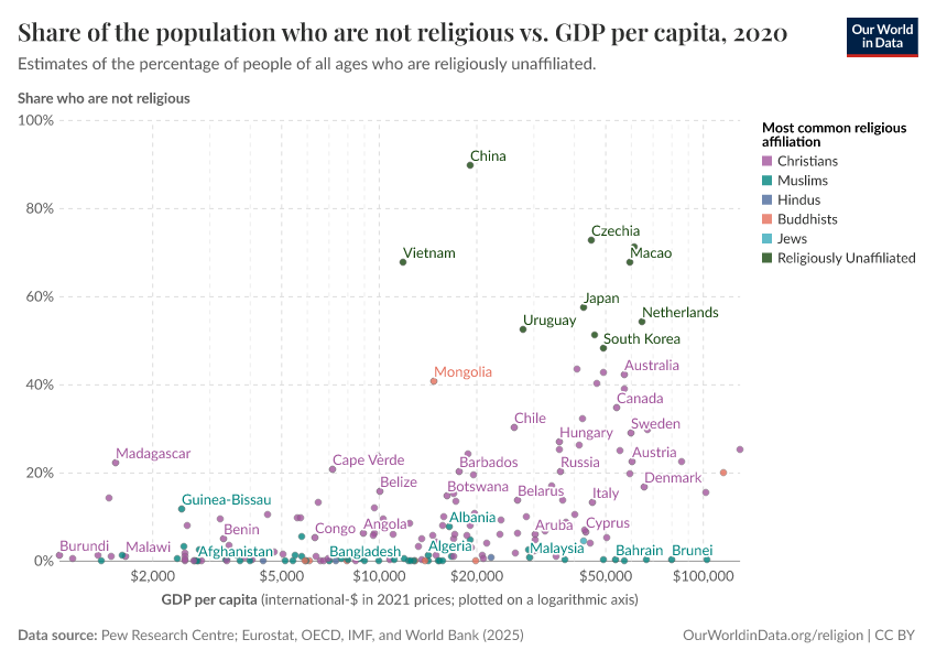 As you can see, rates of non-religiosity tend to be higher in countries with higher incomes.
