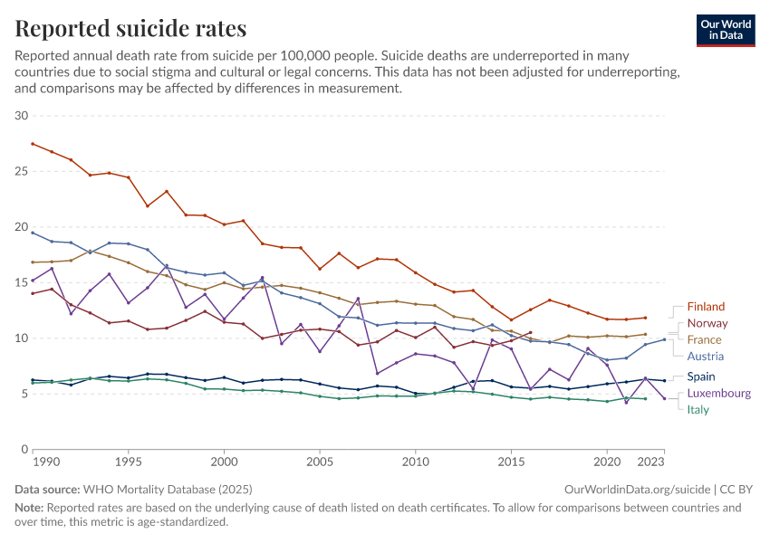 Saloni Dattani, Lucas Rodés-Guirao, Hannah Ritchie, Max Roser, and Esteban Ortiz-Ospina (2023) - “Suicides” Published online at OurWorldinData.org. Retrieved from: 'https://who-regions.owid.pages.dev/suicide' [Online Resource]BibTeX citation