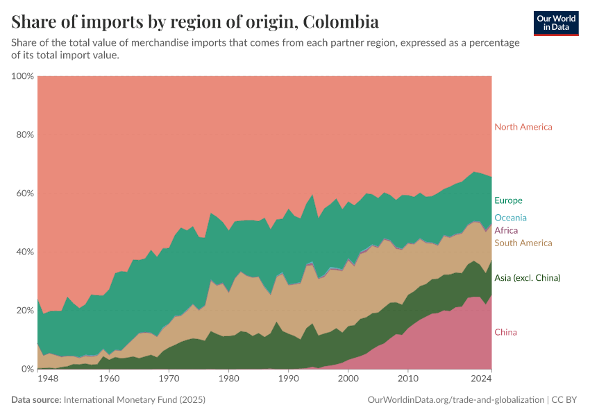 A similar transformation has taken place in South America. Colombia offers a representative case: in 1990, most imported goods came from North America, and imports from China were minimal. Three decades later, Colombia imports slightly more from Asia than from North America, with much of this increase coming from China.11