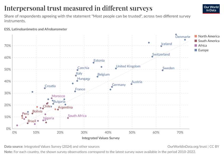 Esteban Ortiz-Ospina, Max Roser, and Pablo Arriagada (2016) - “Trust” Published online at OurWorldinData.org. Retrieved from: 'https://who-regions.owid.pages.dev/trust' [Online Resource]BibTeX citation