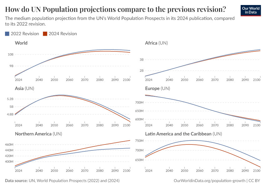 Hannah Ritchie and Lucas Rodés-Guirao (2024) - “Peak global population and other key findings from the 2024 UN World Population Prospects” Published online at OurWorldinData.org. Retrieved from: 'https://who-regions.owid.pages.dev:8789/20260304-094028/un-population-2024-revision.html' [Online Resource] (archived on March 4, 2026).BibTeX citation