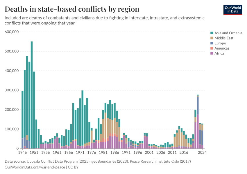 Bastian Herre, Lucas Rodés-Guirao, and Max Roser (2024) - “War and Peace” Published online at OurWorldinData.org. Retrieved from: 'https://who-regions.owid.pages.dev/war-and-peace' [Online Resource]BibTeX citation