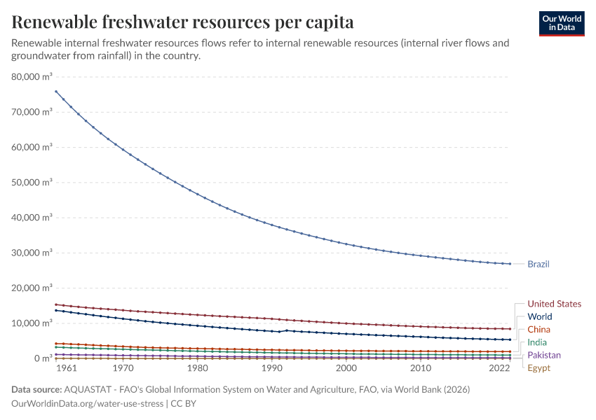 Renewable internal flows are, therefore, an important indicator of water security or scarcity. If rates of freshwater withdrawal begin to exceed the renewable flows, resources begin to decline. The chart shows the level of renewable internal freshwater resources per capita.